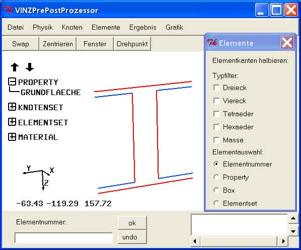Mit dem Menu Elemente/Info kann dies kontrolliert werden. Durch Anwahl des Untermenus Property und Elementinfo Elementnummer werden alle Elementnummern dargestellt. Die Elementnummerierung kann unterschiedlich sein.