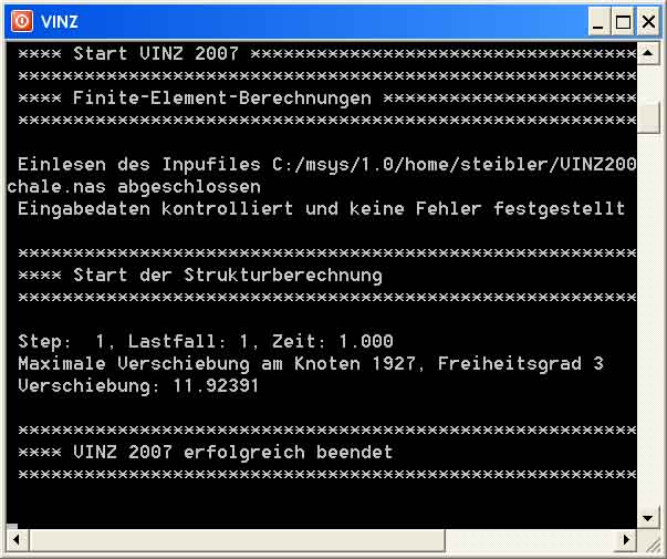 Im Menu Datei/Berechnung starten wird die Berechnung gestartet. Im Konsolefenster und auch in der Datei *.prt wird die Berechnung protokolliert. Erkannte Eingabefehler werden in der *.prt Datei angegeben.