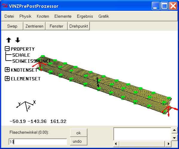 Durch Aufrufen des Menus Physik/Property/Definition/Modifikation/Info weist man den Schalen ein Material und eine Dicke, den Schweisspunkten nur ein Material zu. Klickt man im aufgeblaetterten Strukturbaum bei geoeffnetem Menufenster Property definieren/modifizieren/info auf den Namen der gewuenschten Property, so wird das Menufenster elementspezifisch angepasst und der Propertyname automatisch ausgefuellt. Die einzelnen Eingabefelder sind zu ergaenzen. Die Mateialauswahl kann analog zur Propertyauswahl mit dem Strukturbaum erfolgen. Die Eingabe wird fuer jede Property durch den ok-Button des Menufensters bestaetigt. Zuerst wird der Schale das Material und die Dicke zugeordnet, dann den Schweisspunkten das Material. Bei Volumenelementen muss das Feld Querschnittsflaeche unbedingt leer bleiben. Anschliessend kann das Menu ordnungsgemaess mit dem cancel-Button des Menufensters verlassen werden. Dadurch werden die Property- bzw. Elementeigenschaften gespeichert.