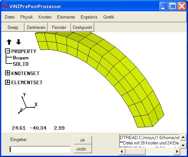 Dann muss im Eingabefeld die Anzahl der Elementschichten und die Gesamthoehe der zu erzeugenden, parallelen Volumenelemente angegeben und mit der return-Taste, dem ok-Button oder der rechten Maustaste bestaetigt werden. Darauf muss im Eingabefeld die gewuenschte Property der neuen Elemente eingegeben und mit der return-Taste, dem ok-Button oder der rechten Maustaste bestaetigt werden. Existiert die gewuenschte Property bereits, kann sie alternativ im Strukturbaum mit der linken Maustaste ausgewaehlt werden. Anschliessend koennen Elemente ausgewaehlt werden, aus denen die neuen Elemente erzeugt werden sollen. Die neuen, durch Parallelverschiebung erzeugten Elemente, werden durch rote Linien dargestellt. Die neuen Elemente werden erst gespeichert, wenn das Menu ordnungsgemaess verlassen wird. Dies erfolgt mit der return-Taste, dem ok-Button oder der rechten Maustaste, wobei das Eingabefeld leer sein muss. - Ohne ordnungsgemaesses Verlassen des Menus sind die Eingaben verloren! - Solange man sich im Menu befindet, koennen mit dem undo-Button die zuletzt erzeugten Elemente wieder entfernt werden. Die Eingabe der Elementanzahl, der Hoehe und des Propertynamens kann nicht durch den undo-Button rueckgaengig gemacht werden. |