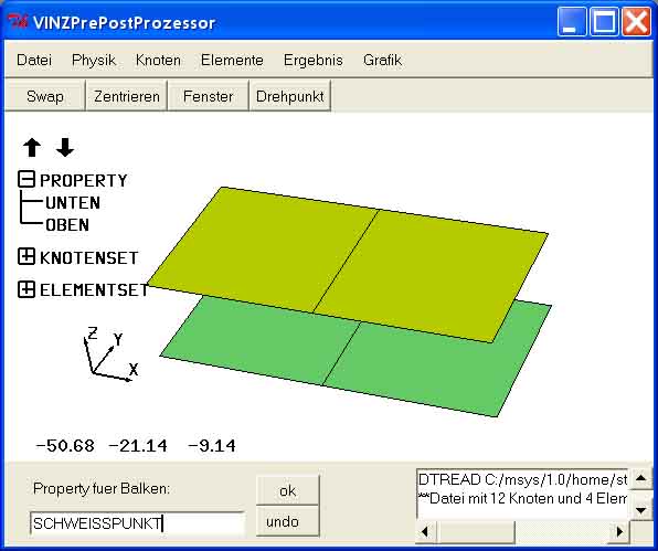 Zuerst muss im Eingabefeld der Propertyname der zu erzeugenden Balken eingegeben und mit der return-Taste, dem ok-Button oder der rechten Maustaste bestaetigt werden. Besteht die Property bereits, kann sie alternativ mit der linken Maustaste im Strukturbaum angeklickt werden. Wird eine Property angeklickt, die nicht zu Balkenelementen gehoert, wird die Eingabe ignoriert. Anschliessend muss ein Suchradius der Schweisspunkte im Eingabefeld eingegeben und mit der return-Taste, dem ok-Button oder der rechten Maustaste bestaetigt werden. Der Suchradius gibt an, in welchem Umkreis vom ersten Anbindungspunkt des Schweisspunkt der zweite Anbindungspunkt gesucht wird. Er muss groesser wie der Abstand der zu verbindenden Bauteile sein, sollte aber auch nicht zu gross sein, dass nicht sinnlose Anbindungspunkte gefunden werden. Dann muessen im Eingabefeld die xyz-Koordinaten des ersten Anbindungspunkt eingegeben und mit der return-Taste, dem ok-Button oder der rechten Maustaste bestaetigt werden. Die einzelnen Zahlen werden durch Leerzeichen (keine Komma) voneinander getrennt. Alternativ kann in der Zeichenflaeche die Position innerhalb eines Elements durch Anklicken mit der linken Maustaste bestimmt werden. Falls ein zweiter Anbindungspunkt gefunden wird, wird eine rote Verbindungslinie gezeichnet. Anschliessend kann ein weiterer Schweisspunkt eingegeben werden. Die Balken und RBE3-Elemente werden erst gespeichert, wenn das Menu ordnungsgemaess verlassen wird. Dies erfolgt mit der return-Taste, dem ok-Button oder der rechten Maustaste, wobei das Eingabefeld leer sein muss. - Ohne ordnungsgemaesses Verlassen des Menus sind die Eingaben verloren! - Solange man sich im Menu befindet, kann mit dem undo-Button die Erzeugung der zuletzt erstellten Elemente wieder rueckgaengig gemacht werden. Die Eingabe des Propertynamens und des Suchradius kann nicht rueckgaengig gemacht werden. - Falls kein zweiter Anbindungspunkt gefunden wird, wird die Eingabe der Koordinaten des Anbindungspunktes ignoriert. Es ist oft hilfreich, die Position leicht zu verschieben. - Der Property der Schweisspunkte muessen Balkeneigenschaften und ein Material zugeordnet werden. |